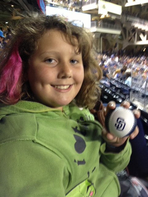 This didn’t discourage her a bit. She said, as if it were fact, “Mom, I just know that something good is going to happen for me at the game tonight.” Somehow that darned camera kept panning over what seemed like everyone else but her. Still she remained optimistic. When the Padres mascot came out on the field during a time out for switching pitchers, he had a handful of little soft souvenir baseballs with the Padres logo on them. I saw her eyes light up and she immediately jumped up and started waving her arms in the air. Lo and behold, one of the little souvenir balls headed toward our section and was heading a bit to the left of where she was standing. I held my breath, hoping that she wouldn’t be too disappointed when she didn’t get it, and then a hand reached out and grabbed the ball out of the air. No, it wasn’t Aurora’s, but it was my boyfriend Todd’s. No sooner had he made the miraculous catch than he handed the ball to Aurora. I could almost feel the beams of happiness shooting out of her! 🙂