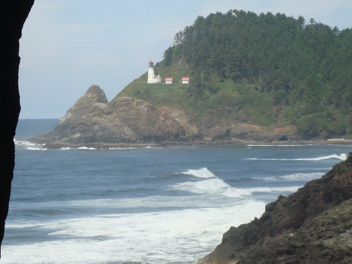 The always beautiful Oregon coast with a view of a lighthouse on the distant shore as seen from the Sea Lion caves.