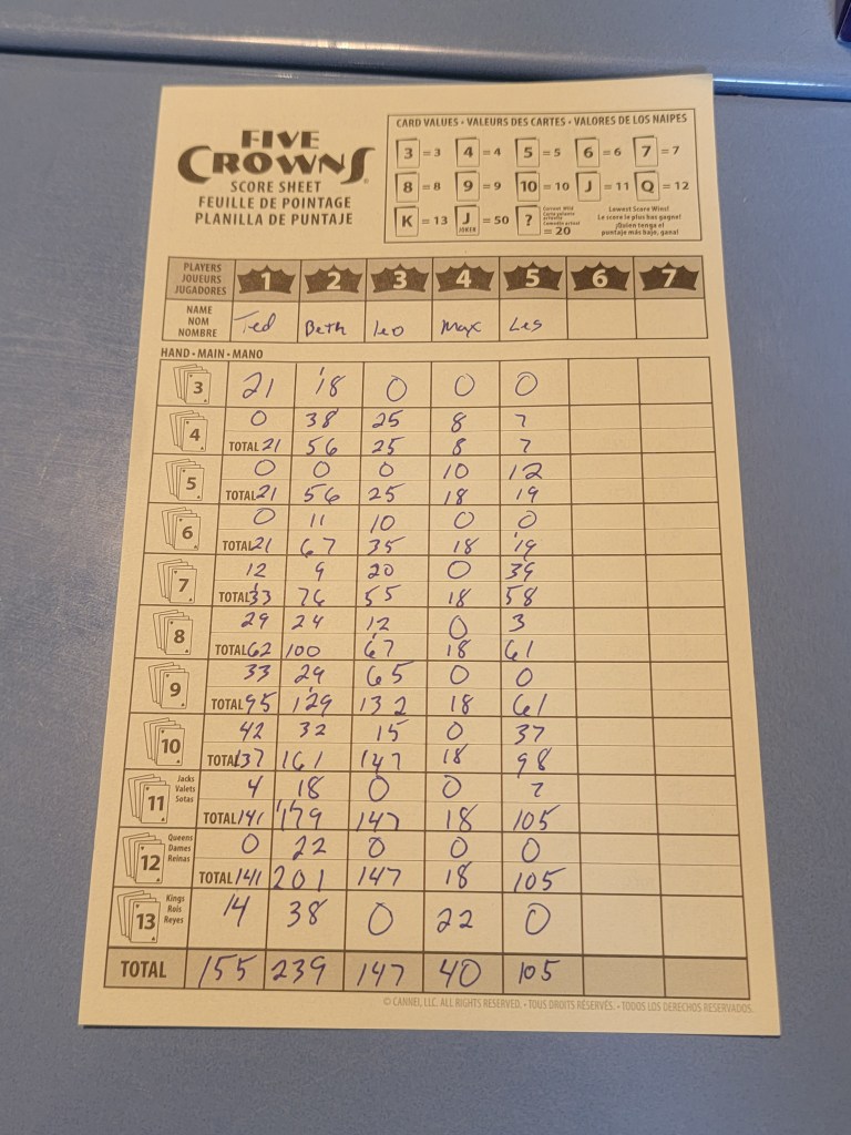 We entertained ourselves in the evenings with the card game Five Crowns. If the object of the game had been to have the highest score, I’d be a champion! 😅 As it was, though, Maxcine smoked us all!! 🌪😜🌪 There was one game, though, that my dad, Leo, was the big winner. He reminded us all a few times the morning after. 😄